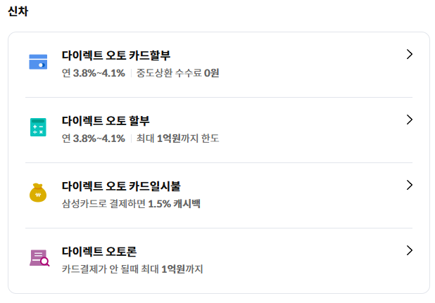 | 삼성카드 다이렉트 오토 | 연 4.5% | 100% 비대면 | 신차/중고차 | 보험 할인, 주유 할인 |